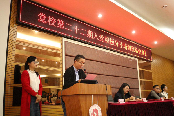 典礼上,建筑工程系党总支副书记陈燕峰对这次培训做了总结汇报,指出这次培训在党的十九大召开之际,虽然时间短,课程紧,但是同学们积极对待,克服了与自身专业课的冲突,充分展现了入党积极分子的积极性。本次培训班共68名学员,因病请假1人,顺利通过培训结业的有62名学员,合格率达到92.5%。
