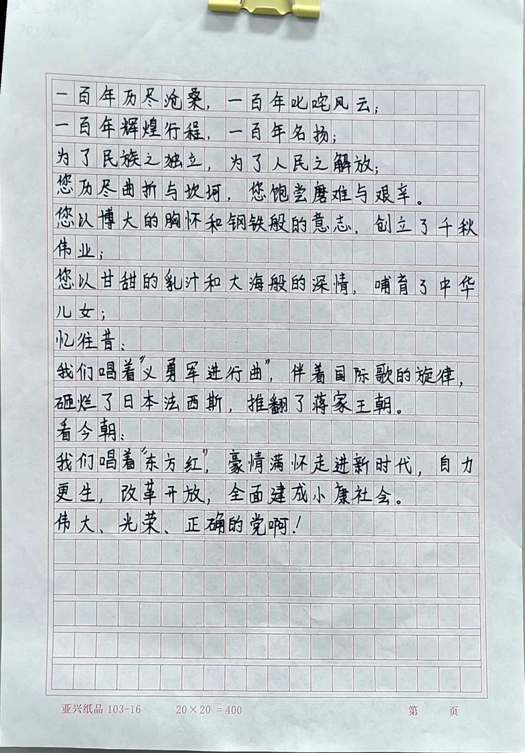 一百年前,伟大的中国共产党诞生了!他如飞天的雄鹰,冲上云霄守护祖国的片片疆土。她如爱子的父母,任劳任怨照顾祖国的千万儿女。他勇敢无畏,带领全国人民走向胜利。她无私伟大,甘愿牺牲自己换来国泰民安。漫长的征途,艰难的奋战,共产党从未有怨言。在党的正确领导,我们紧紧追随。党的件件恩情,我们铭记不忘。从1921年党的正式创建,到现在已有百年的历史了。