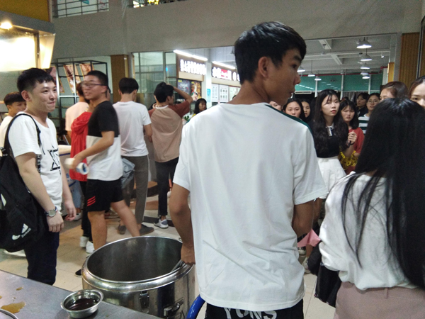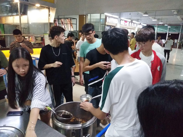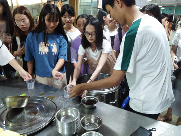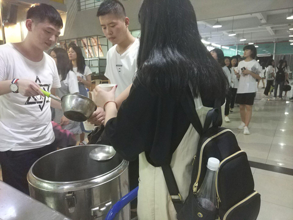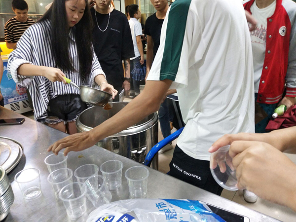 下午时分,雨越下越大,辅导员和班导们眼看着新生们在大雨中结束军训,担心新生们会因为淋了雨而感冒,就紧急联系了公司餐厅准备材料开始煮红糖姜茶。