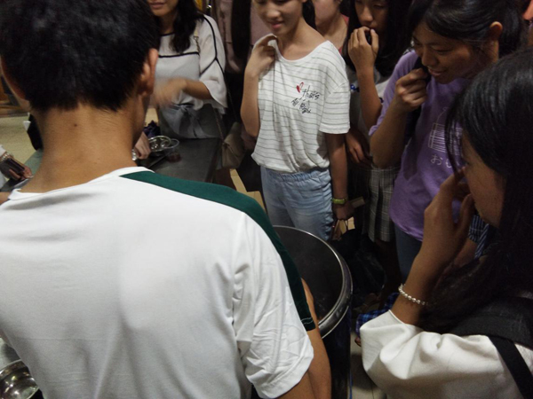 大雨纷纷,而辅导员和导们的心都牵在新生们身上,恨不得三步并作两步,赶紧把这红糖姜茶送到他们手中,让这腾腾的热气暖到同学们的身子。为了不让姜茶变凉,一旦姜茶煮好就马上集合新生去食堂。辅导员和班导将一杯杯热腾腾的姜茶递到军训新生们手中。看着他们缓缓地喝下,才放下心来。